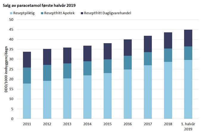 Sammenlignet med samme periode i fjor var det i første halvår 2019 en liten økning i reseptfritt salg, målt i antall solgte doser (definerte døgndoser, DDD), se tabell nedenfor.